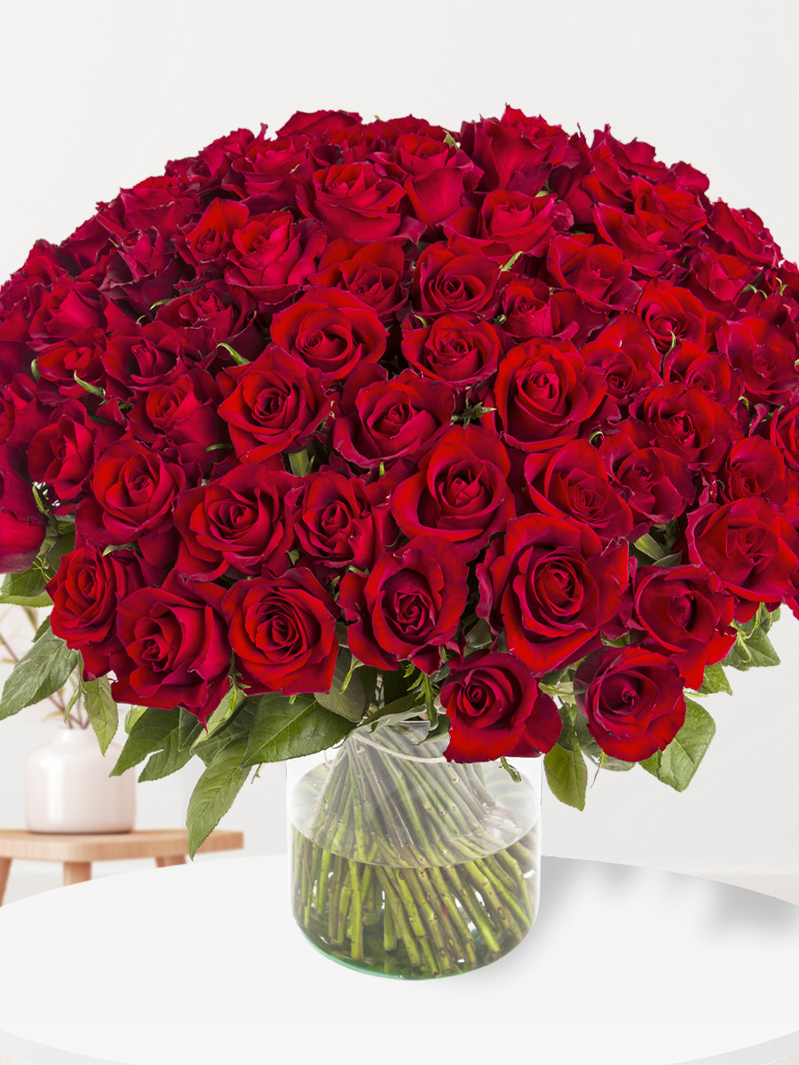 Een boeket met 100 rode rozen, 100% liefde – een overweldigend gebaar van toewijding. Zeg ook dat je uniek bent en dat mijn gevoelens grenzeloos zijn. De EverRed-roos is een roos van hoge kwaliteit. Je kunt ook 100 rode rozen van het ras Red Naomi bestellen. Het verschil? De Red Naomi-roos komt uit Nederland, deze uit Kenia. De steel van de EverRed-roos is iets korter dan die van de Red Naomi-roos en je ziet een verschil in de bloemblaadjes van beide rozen. De bloemblaadjes van de EverRed voelen fluweelzacht aan. Maak gebruik van het persoonlijke bericht en schrijf waarom de ontvanger dit verdient en van wie dit prachtige boeket rozen afkomstig is. De factuur wordt uiteraard niet meegeleverd, maar ontvang je apart per e-mail. Het boeket wordt in wit papier gewikkeld en met een bruin-roze strik omwikkeld. Zo wordt het boeket in de doos bevestigd. We willen dat het openen van de cadeauverpakking voor de ontvanger zoveel mogelijk een verrassing en een cadeau blijft!