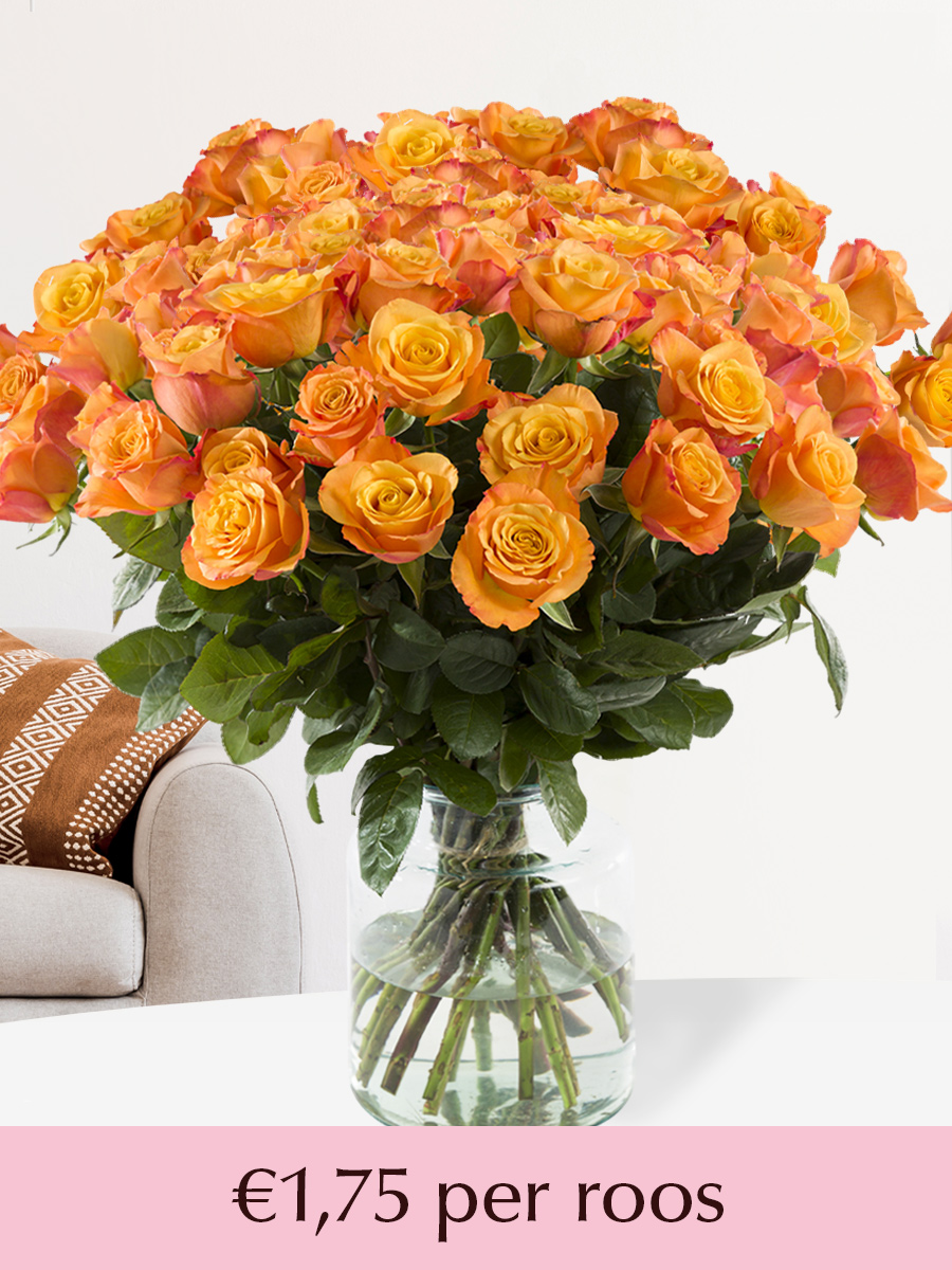 Bestel deze felgekleurde oranje rozen nu in ieder gewenst aantal. Bij Surprose kun je zelfs deze oranje rozen in een aantal tot 499 stuks bestellen. Deze knaloranje rozen van de soort Confidential worden door Timaflor in Kenia gekweekt en hebben een steellengte van ongeveer 50 centimeter. Bij dit product kun je deze oranje rozen bestellen in een aantal van 100 tot en met 499 stuks. Ook kun je deze rozen hier in ieder gewenst aantal vanaf 10 tot en met 99 stuks () bestellen. Overtref jezelf met het geven van een boeket van bijvoorbeeld 150 of 200 rozen, of gebruik deze optie om rozen te bestellen zodat je aan vele mensen een aantal rozen cadeau kunt geven. Zorg voor kleur in meerdere interieurs door deze prachtige rozen in een groot aantal te verdelen over jou vrienden, familie of andere gewaardeerde personen. Verras nu met deze opvallende rozen van Surprose.