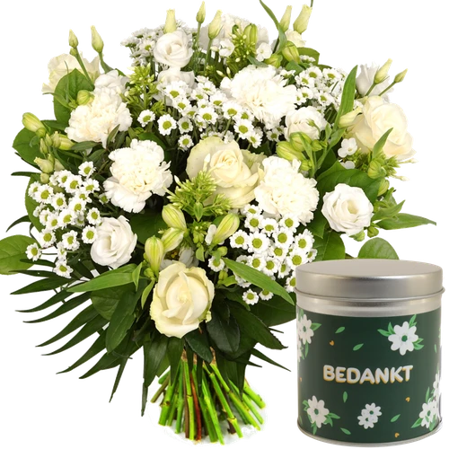 Bedankt bloemen wit + blikje bedankt bij BoeketCadeau.nl