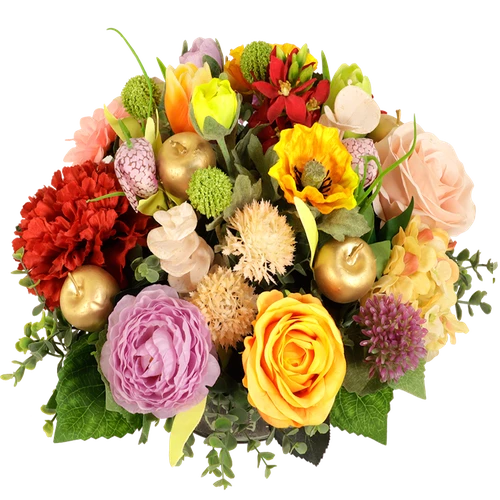 Kunstbloemen bloemstuk in bonte kleuren rond opgemaakt. Een kleurrijk geheel om je interieur op te vrolijken.