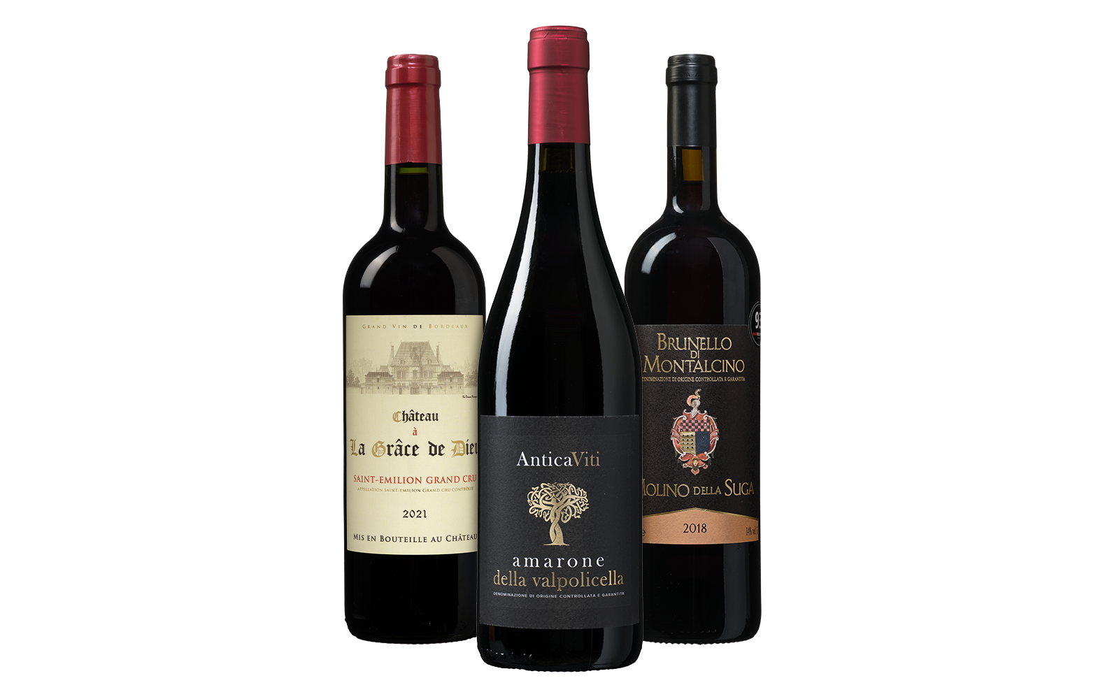 Château à la Grâce de Dieu Saint-Émilion Grand Cru Deze klassieke Bordeaux is het toppunt van elegantie. Rijpe tonen van zwarte kersen, pruimen en een vleugje ceder vormen een harmonieus geheel. Zijdezacht en complex, een wijn die perfect samengaat met rood vlees, wild of een feestelijk diner. Molino della Suga Brunello di Montalcino Een Toscaanse trots met een verfijnd karakter. Deze Brunello biedt diepe smaken van kersen, kruiden en een vleugje tabak, met een lange, verfijnde afdronk. Heerlijk bij stoofschotels of rijke pasta’s. AnticaViti Amarone della Valpolicella De krachtpatser van het pakket! Een intense Amarone boordevol smaken van gedroogde vijgen, chocolade en zwarte bessen. Vol en weelderig, perfect om te combineren met kaasplankjes of een sappig stuk vlees.