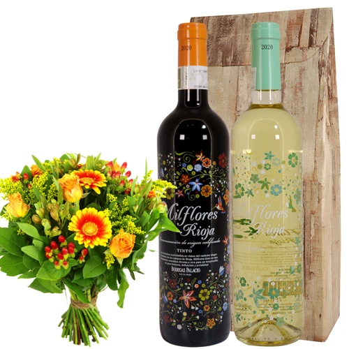 Bloemen samen met wijn versturen? Een vrolijk geel oranje boeket met bijpassende wijnen. Bestel online bij BoeketCadeau.nl