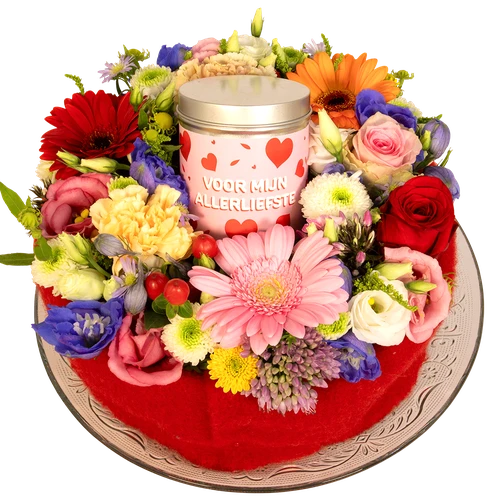 Een bloementaart uniek in zijn soort, rijkelijk van kleur met een blikje hartjes snoep. De tekst ” Voor mijn allerliefste ” en rode hartjes staan afgebeeld op het blikje.