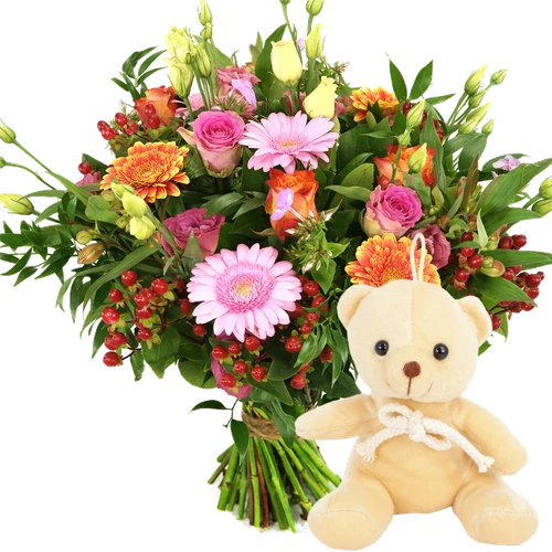 Een boeket in vrolijke roze en oranje tinten met een extra lief licht bruin knuffeltje van 16 cm. Wie wordt er verrast met dit cadeau? Bestel eenvoudig online bij BoeketCadeau.nl