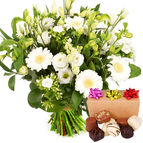 Witte bloemen en heerlijke handgemaakte bonbons in een geschenkdoos samen bezorgd in heel Nederland 6 dagen per week. Thuiswinkel lid.