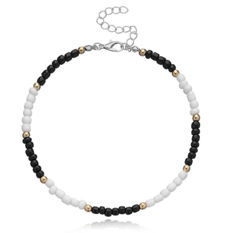 De bohemian stijl kralen van 4mm in de kleuren zwart, wit en goud geven deze enkelband een unieke en charmante uitstraling.
