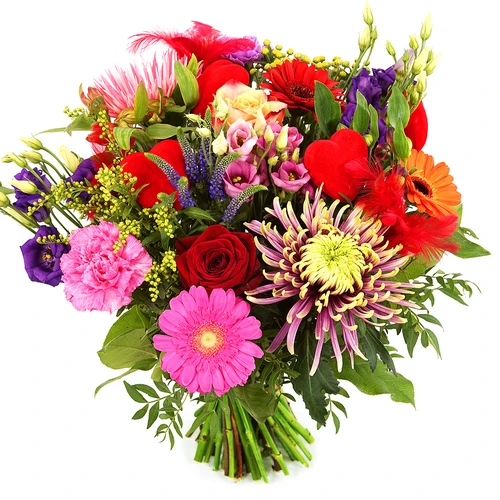 Bont boeket bloemen met rode hartjes bestellen en laten bezorgen door BoeketCadeau.nl Een origineel liefdesboeket!