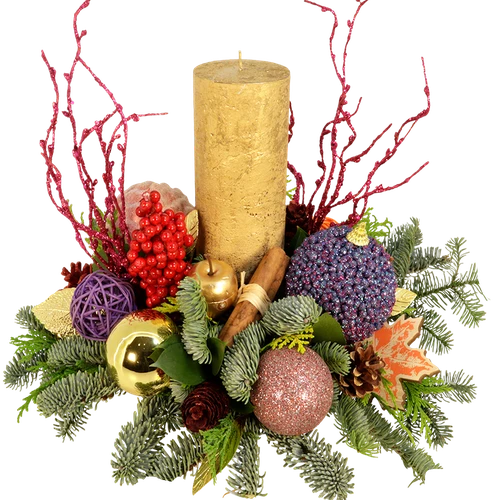 Een bont kerststuk in diverse kleuren met een prachtige dikke gouden kaars. Een bijzonder kerststuk met mooie kerst materialen. Bestel vandaag nog! Thuiswinkel