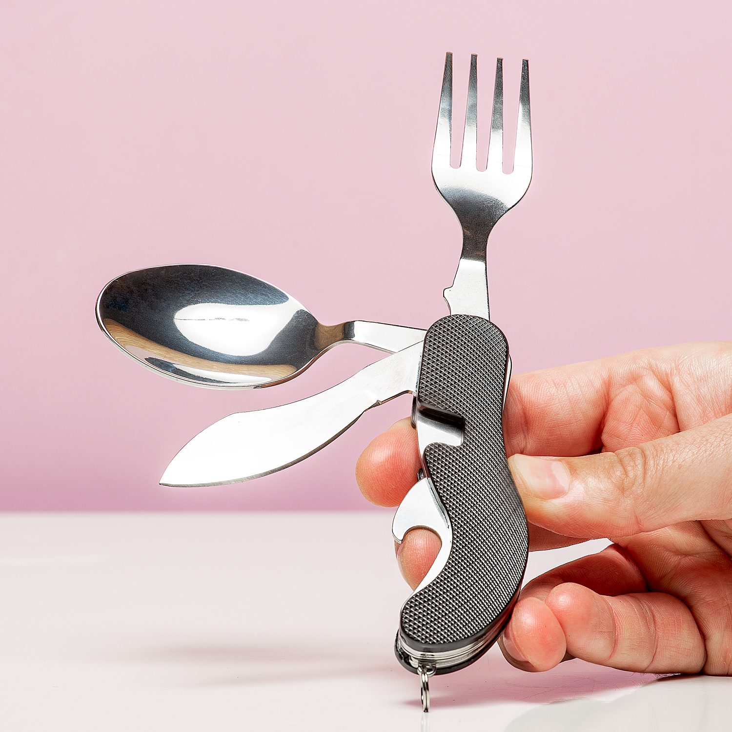 Het Camping bestek van Invotis is een luxe bestekset die je kan inklappen en eenvoudig mee kan nemen. De set is aan elkaar vast te maken door de vork uit te klappen. Handig tijdens een kampeertrip of als je naar de camping gaat. Gemaakt van roestvrij staal en aluminium.