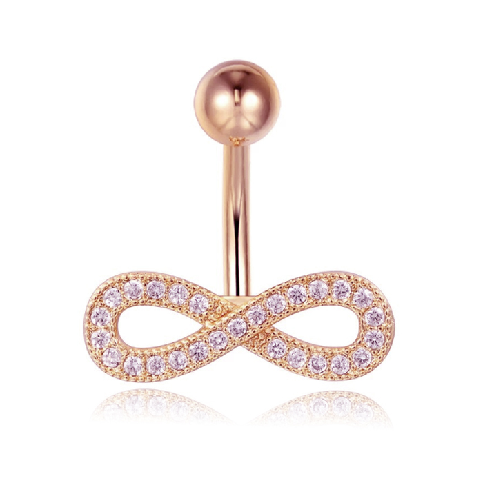 De onderkant van de piercing is in de vorm van een infinity teken. Bedekt met een rij glimmende strass steentjes.
