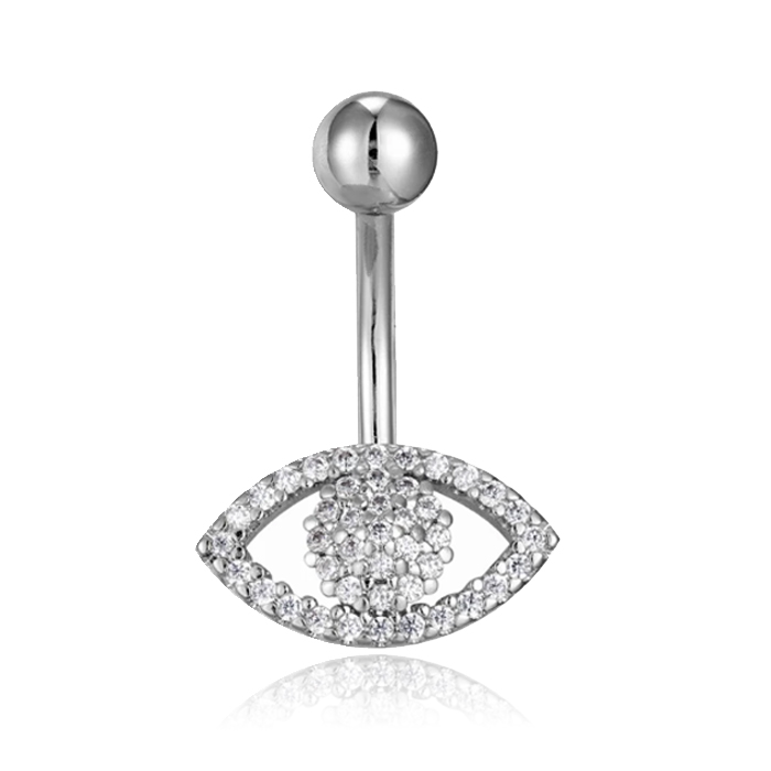 De onderkant van de piercing is in de vorm van een oog. Volledig ingelegd met glimmende strass steentjes.