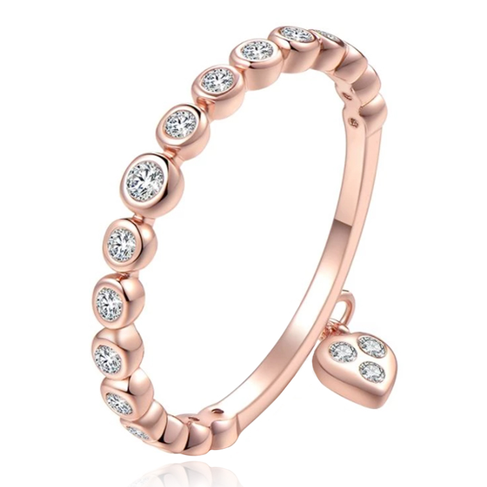 Elegante vergulde dames ring van koper. De rose kleurige ring is voorzien van heldere Zirkonia steentjes die het sieraad een stijlvolle uitstraling geven. Door het hartvormige bedeltje met 3 steentjes is de ring een echte eyecatcher. De smalle ring is 2.5 mm breed en weegt 2 gram.