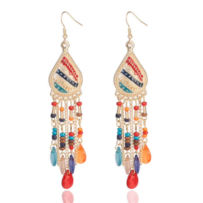 De druppelvormige hanger is het centrale punt van de oorbellen en is afgewerkt met een rode en blauwe afwerking.