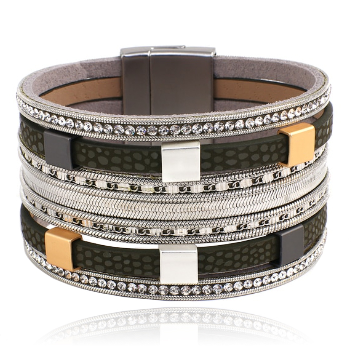 De armband is afgewerkt met een grote zilverkleurige sluiting die zorgt voor een stijlvolle touch.