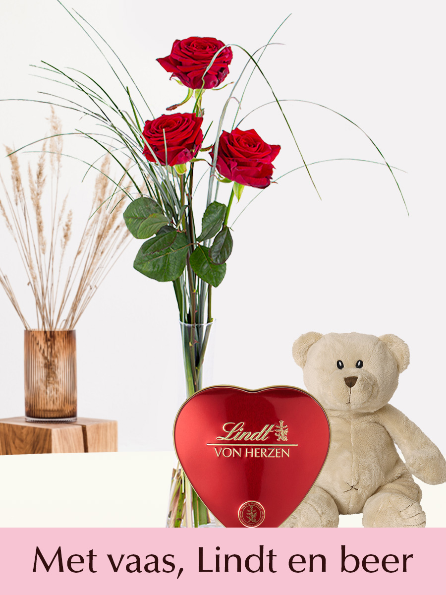Een compleet geschenk dat je kunt bestellen en versturen voor Valentijnsdag. De rozen zijn de bekende Red Naomi rozen, gekweekt in Nederland. Bij de rozen binden onze bloembindsters een aantal takken beregras. Het handgebonden boeket wordt verpakt als een echt geschenken vastgebonden in de doos met een roze-bruin lintje. Bestel en verstuur je cadeau voor Valentijnsdag eenvoudig online!