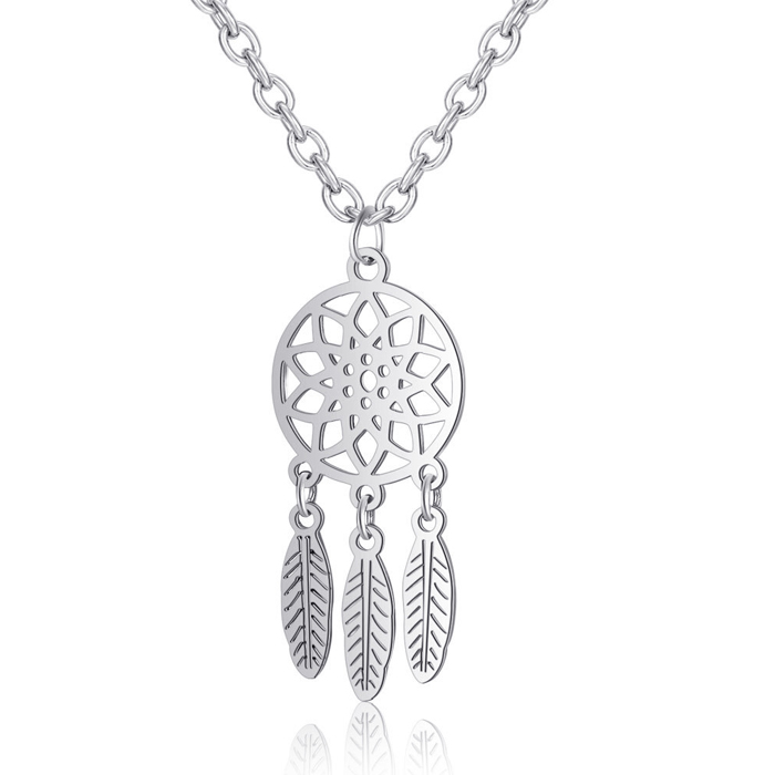 Prachtige zilverkleurige damesketting van edelstaal met een hanger in de vorm van een dromenvanger. De hanger heeft 3 losse veertjes en is verstelbaar in een lengte van 45 + 5 cm. De hanger heeft een afmeting van 31 x 14 mm. Deze opvallende hanger en de schakelketting hebben een gewicht van 4 gram.