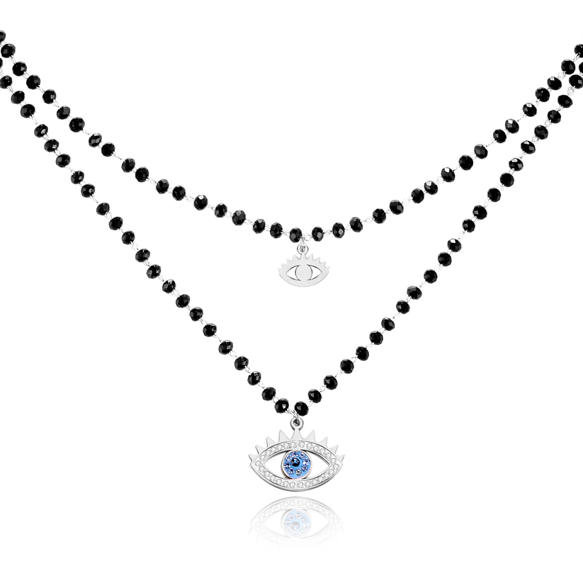 Aan beide kettingen hangt een hanger in de vorm van een oog, waarvan één bezet is met steentjes. De ketting heeft een lengte van 39 + 5cm.