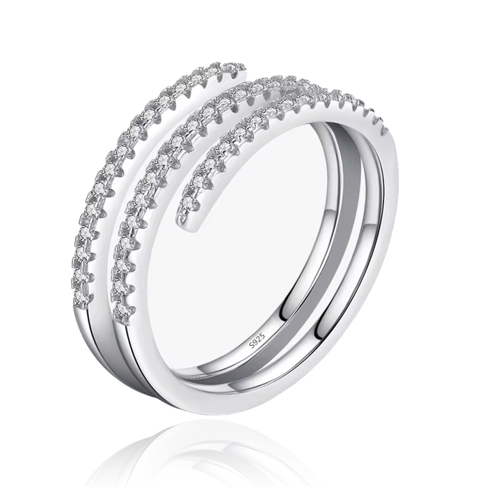 Deze prachtige Elenza ring is gemaakt van hoogwaardig Sterling .925 zilver en heeft een opvallend ontwerp met twee banden bezaaid met schitterende zirkonia steentjes. De ring combineert elegantie met een moderne uitstraling, ideaal voor vrouwen die houden van luxe maar subtiele sieraden. Perfect voor zowel dagelijks gebruik als speciale gelegenheden.