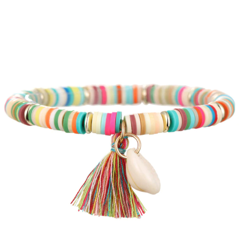 Het middelpunt van de band is versierd met een schelp en een kwastje. Perfect voor een zomerse outfit.