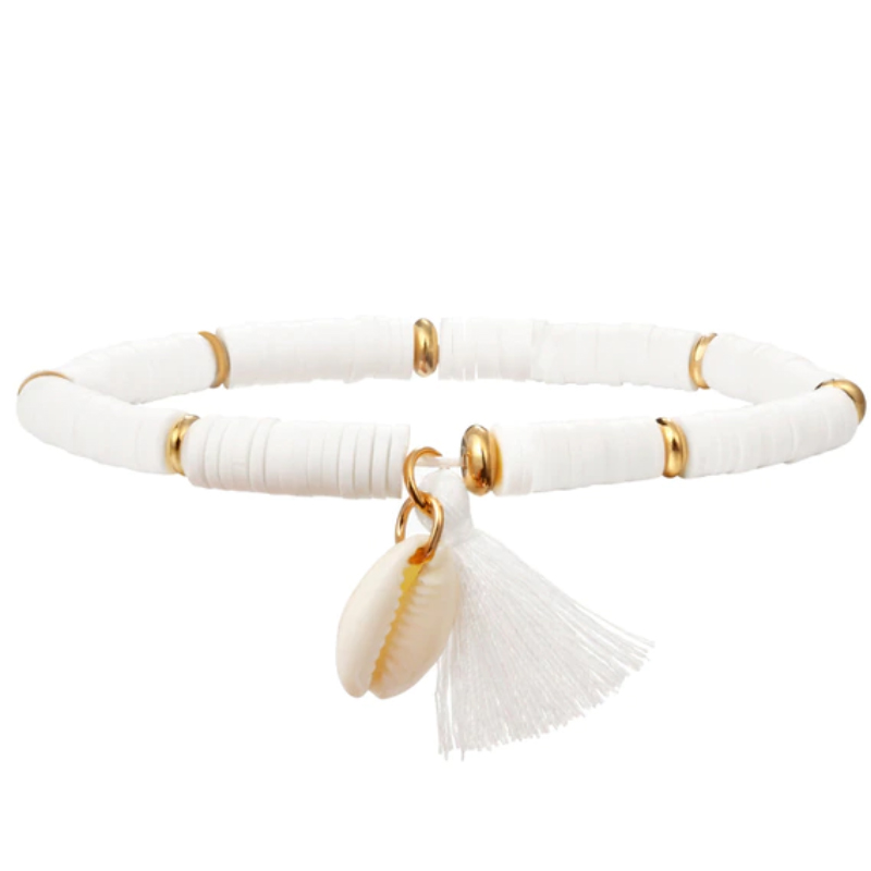 Het middelpunt van de band is versierd met een schelp en een kwastje. Perfect voor een zomerse outfit.