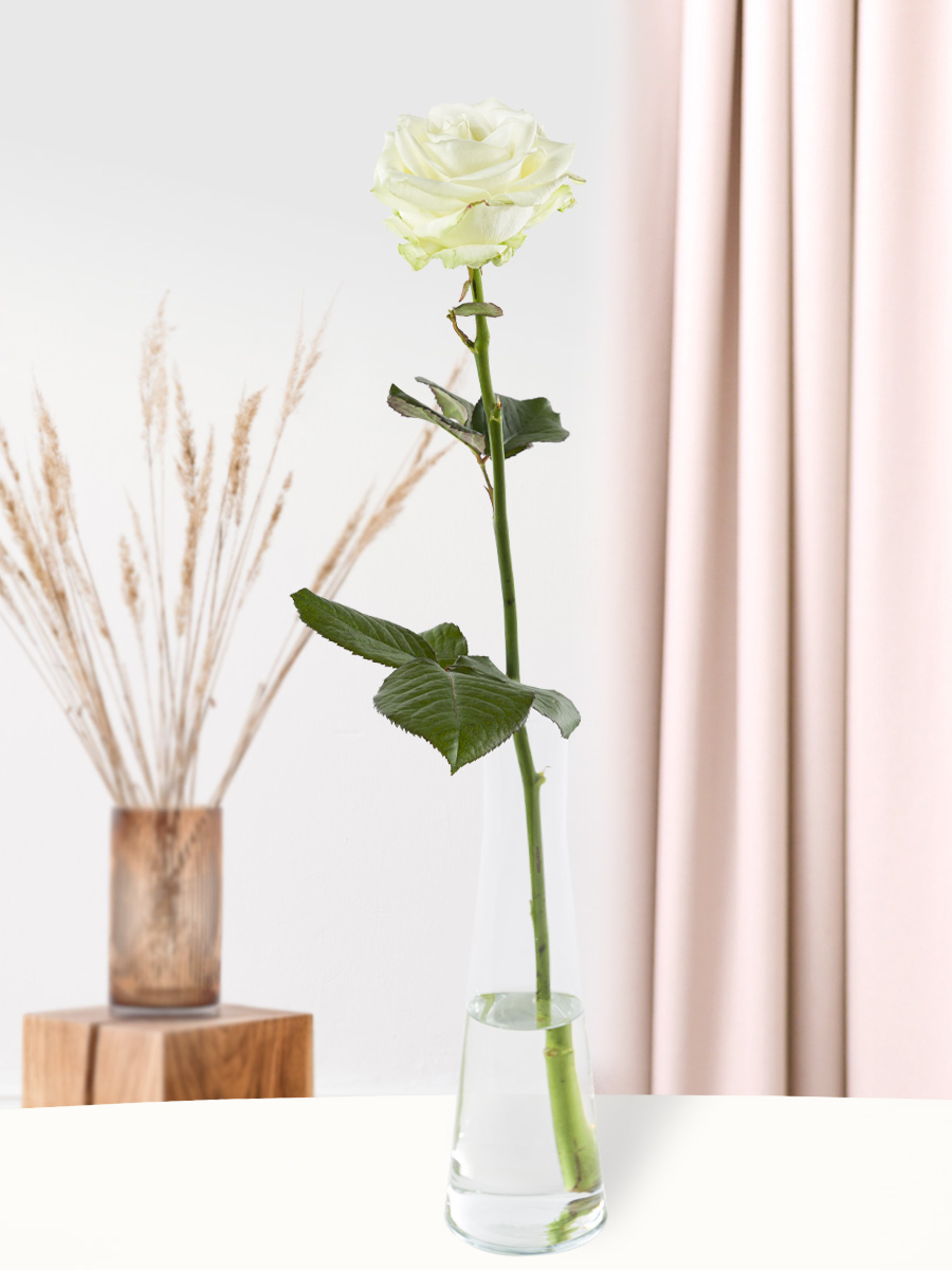 Deze Nederlandse witte roos is van de soort Avalanche, gekweekt door v. d. Berg Roses. De steel van deze roos is ongeveer 70 centimeter lang. Deze enkele roos wordt geleverd inclusief glasvaasje om het cadeau compleet te maken! Onze rozen worden altijd geleverd met een gratis kaartje, vergeet dan ook niet om je persoonlijke tekst toe te voegen bij de bestelling! Deze roos inclusief vaasje is een leuk cadeau voor een ander, maar ook een geweldig presentje voor jezelf! Heb je altijd al een vaasje gewild voor een enkele bloem? Dan krijg je er met dit product zelfs een witte roos bij zodat je gelijk kan genieten van je nieuwe aankoop. Geef je liever een rode roos of meerdere rozen inclusief glasvaas als cadeau, dat kan ook. Bekijk hier een enkele rode roos inclusief glasvaasje (), of drie witte rozen inclusief glasvaas en Lindt Pralines. ()