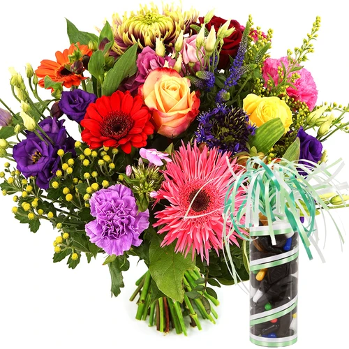 Samengesteld boeket bloemen van fel gekleurde bloemen en als extra 200 gram drop sierlijk verpakt in een koker met een strik. Samen bezorgd in heel Nederland. Thuiswinkel Lid. Bestel vandaag nog!
