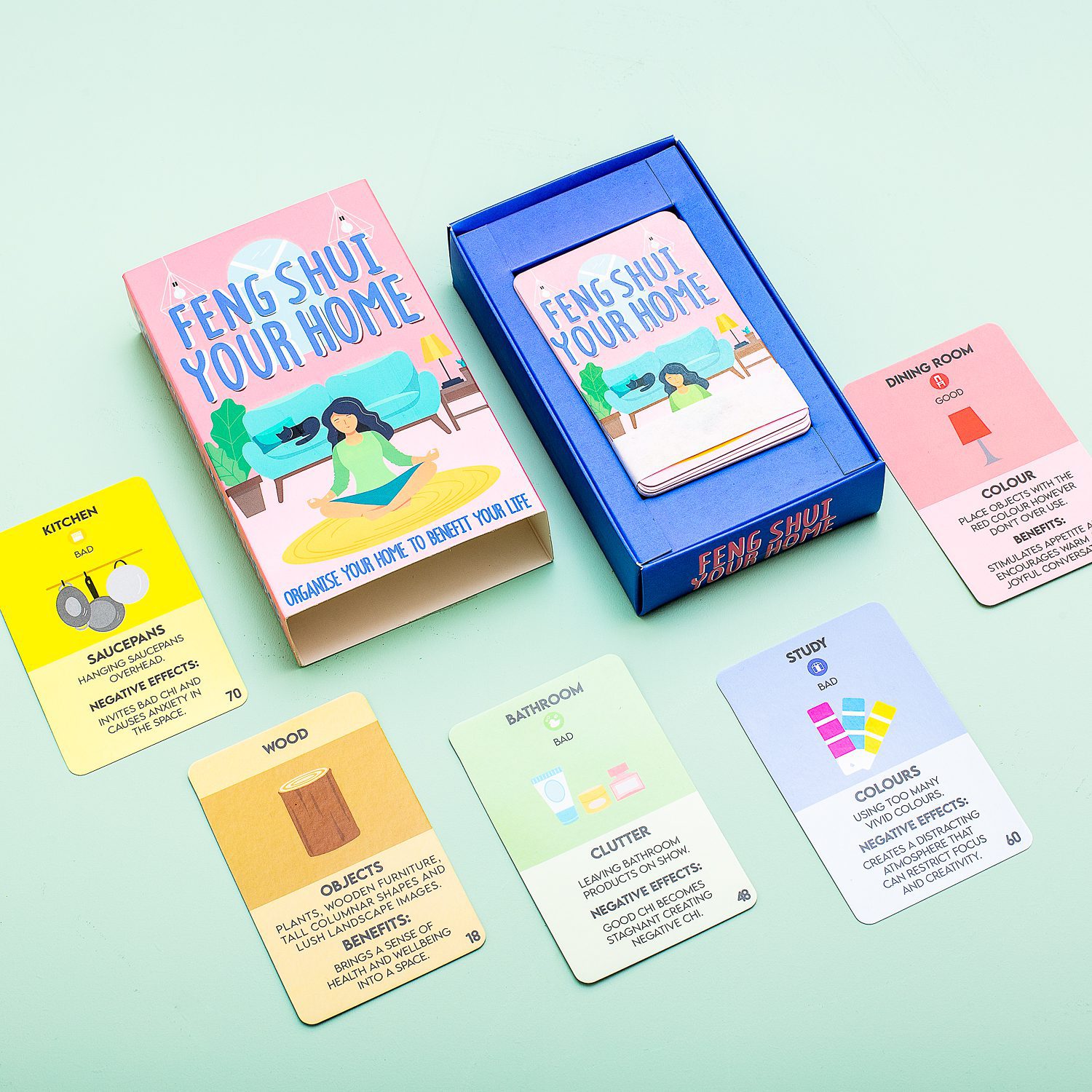 Feng Shui Your Home kaarten van Gift Republic. Set kaarten die je de Chinese filosofie feng shui leren: hoe inrichting en vormgeven invloed heeft op je leven. Set van honderd kaarten met tips voor de verschillende kamers in je woning. De teksten zijn geschreven in het Engels. Afmeting verpakking: 15 x 9 x 4 centimeter.