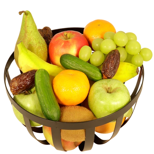 Een stalen bak in de vorm van een mand, een volle fruitmand met vers fruit bestel je hier en kun je laten bezorgen 6 dagen per week in heel Nederland. Thuiswinkel Lid.