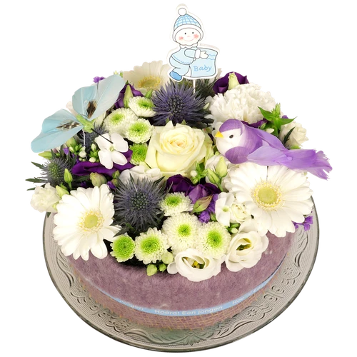 Een bloementaart voor de pas geboren baby voor een jongen in de blauw witte tinten. Makkelijk neer te zetten voor de ontvanger.