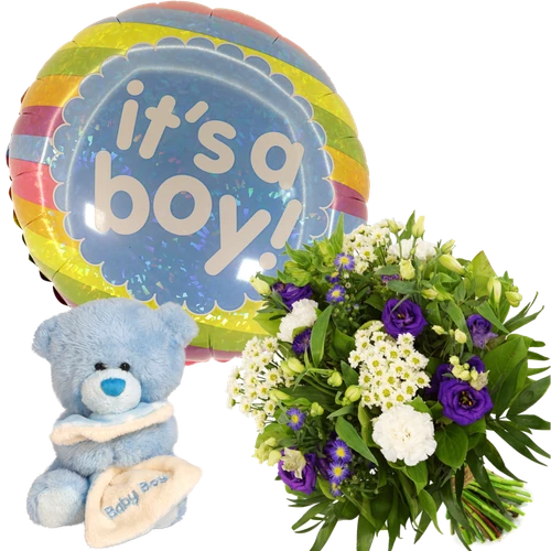 Jongen geboren? Bestel een leuk cadeau voor moeder en kind. Een blauw wit boeket en mooi knuffeltje voor in de box of babybedje en een vrolijke heliumballon. Bestel bij BoeketCadeau.nl