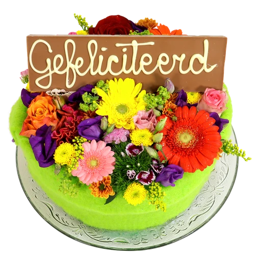 Een bonte bloementaart met een heerlijke reep chocolade van 200 gram met een tekst op: Gefeliciteerd, Beterschap, Bedankt, etc. Bestel en laat deze bezorgen. Thuiswinkel lid.