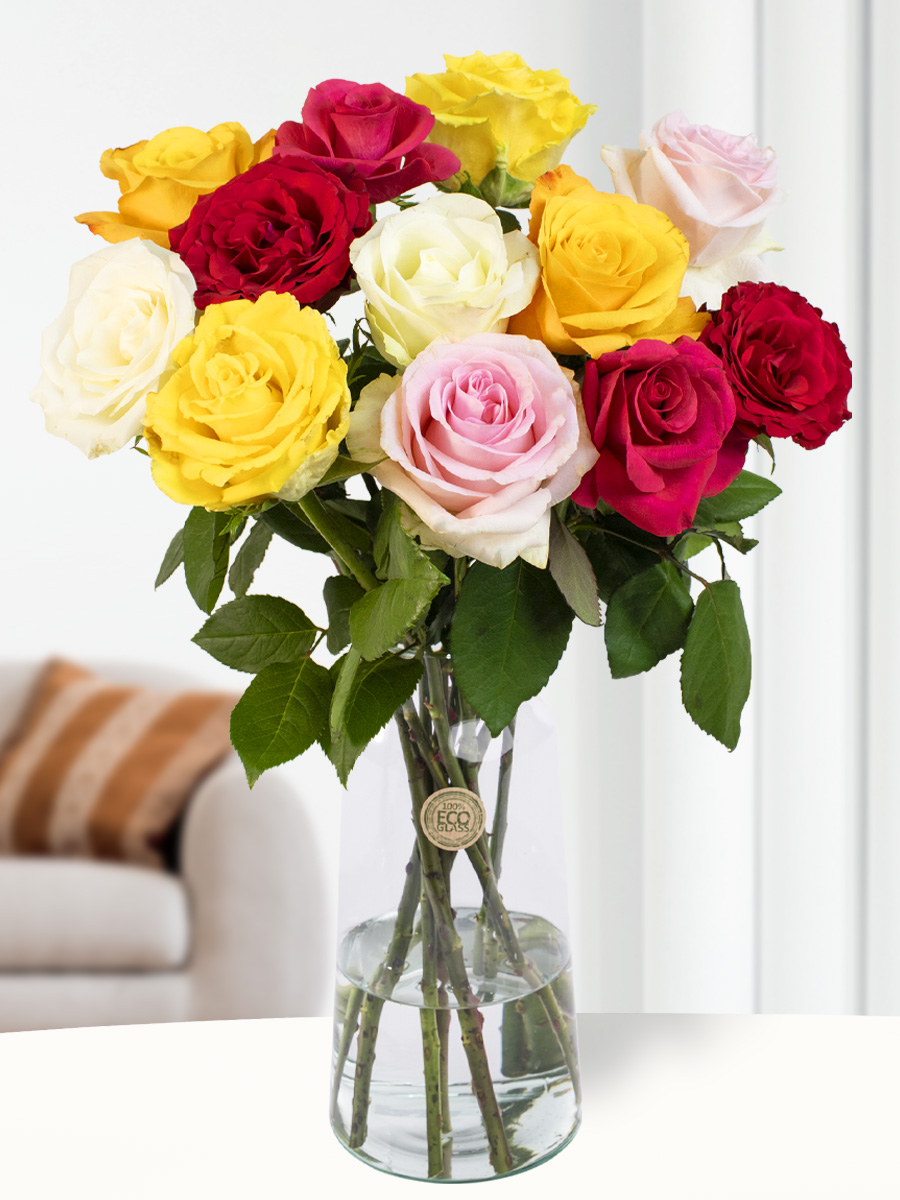 Haal het voorjaar in huis met dit boeket! Met maar liefst 6 verschillende kleuren rozen heb je een bont geheel op tafel. Een boeket dat opvalt en vrolijke kleuren in huis haalt. Dit boeket heeft een steellengte van ca. 50 cm. De rozen worden vers versturd, waardoor het kan zijn dat de rozen nog ietwat dicht zitten als ze binnenkomen. Zet ze op de vaas, snij de stelen bij, voeg de bloemenvoeding toe en de rozen zullen zich prachtig voor je openen op de vaas! Bestel eenvoudig online dit kleurrijke boeket rozen!