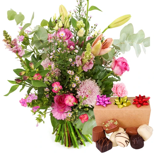 Roze bloemen hoog laag geschikt als een Bloomon boeket, met heerlijke handgemaakte bonbons 300 gram in een geschenkdoos. Bestel vandaag nog deze kan 24/7 bezorgd worden.