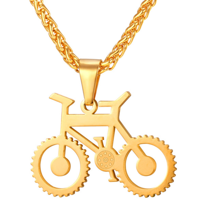 Goudkleurige heren ketting inclusief kettinghanger van Mendes Jewelry. De fiets kettinghanger is vervaardigd uit hoogwaardig verguld edelstaal en heeft een afmeting van 37 x 25mm. De heren ketting heeft een prachtige Vossenstaart schakel en is vervaardigd uit gepolijst edelstaal. De ketting heeft een verstelbare lengte van 58 + 5cm en is 3mm breed. De ketting sluit d.m.v een solide karabijn sluiting. Wij leveren deze schitterende Mendes ketting in geschenkverpakking.