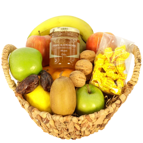 Fruitmand met lekkere honing en honing snoepjes samen mooi op gemaakt in een luxe fruitmand. Lekker vers fruit voor de ontvanger. Bestel vandaag nog.
