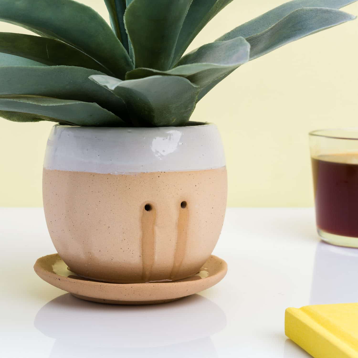 Huilende bloempot van Winkee. Een bloempot met een vrolijk gezichtje, die blije tranen huilt als je de plant water geeft. Grappige bloempot die je zelf een kapsel geeft door de plant die je erin zet. Het overbodige water stroomt uit de bloempot op het bijbehorende schoteltje. Gemaakt van keramiek. Afmeting: 14 x 14 centimeter.
