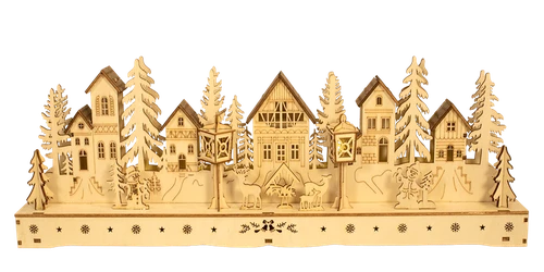 Een straat met houten huizen en lantaarns, kerstboompjes, rendier, etc. De huizen en de lantaarns zijn voorzien van LED verlichting. Bestel eenvoudig op=op