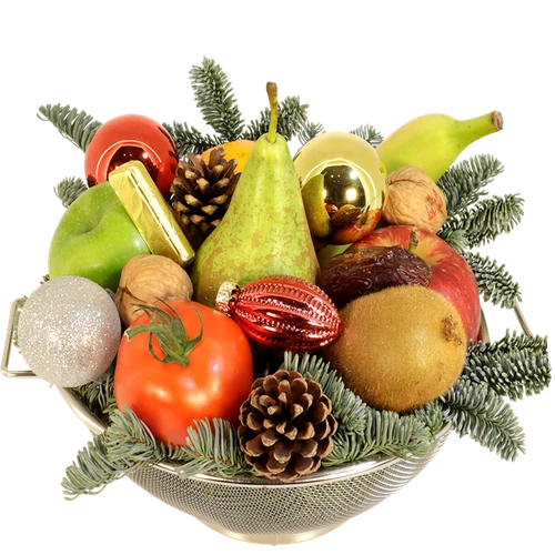 Verse fruit opgemaakt met kerst decoratie een lust voor het oog en fantastisch om te mogen ontvangen voor de ontvanger.