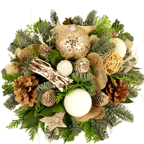 Kerststukken bezorgen in de kleuren goud brons wit. Online kerststuk bestellen en laten bezorgen in Nederland.