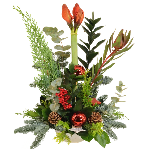 Een Amaryllis in het rood opgemaakt in een kerststuk. Geeft deze cadeau en laat weten dat je aan de ontvanger denk met kerstmis. Thuiswinkel lid.