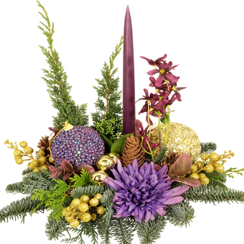 Een kerststuk in de nieuwste trendy kleuren goud en paars met een prachtige kaars er in. Lang houdbaar 4 – 5 weken. Bestel eenvoudig. Thuiswinkel Lid.