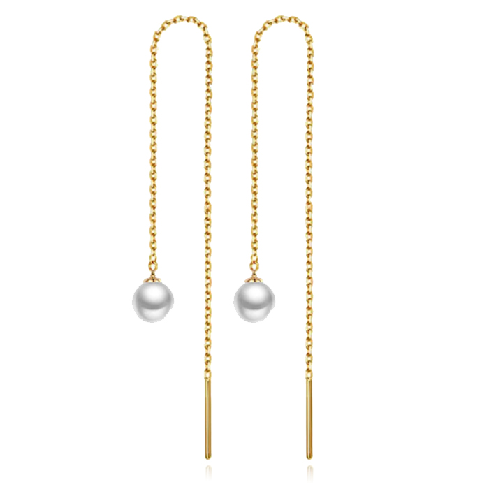 Mooie oorbellen voor dames. Deze goudkleurige ketting oorbellen zijn voorzien van een parel en kunnen daarom ook elegant en chique worden gedragen. De ketting heeft een lengte van 80 mm. De parel heeft een doorsnede van 6 mm. Deze dames oorbellen met ketting wegen 2 gram.