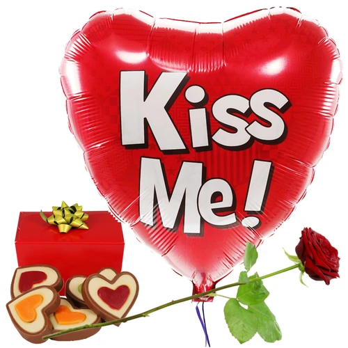 Heliumballon in hartvorm met de tekst Dikke knuffel samen bezorgd met hartjes chocolade en een verse rode roos.