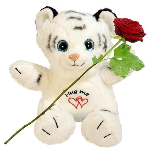 Een witte knuffelbeer in de vorm van een tijger met de tekst “Hug me” op zijn buik. Op de manier kun jij jouw geliefde verrassen. Ook anoniem. Thuiswinkel Lid.