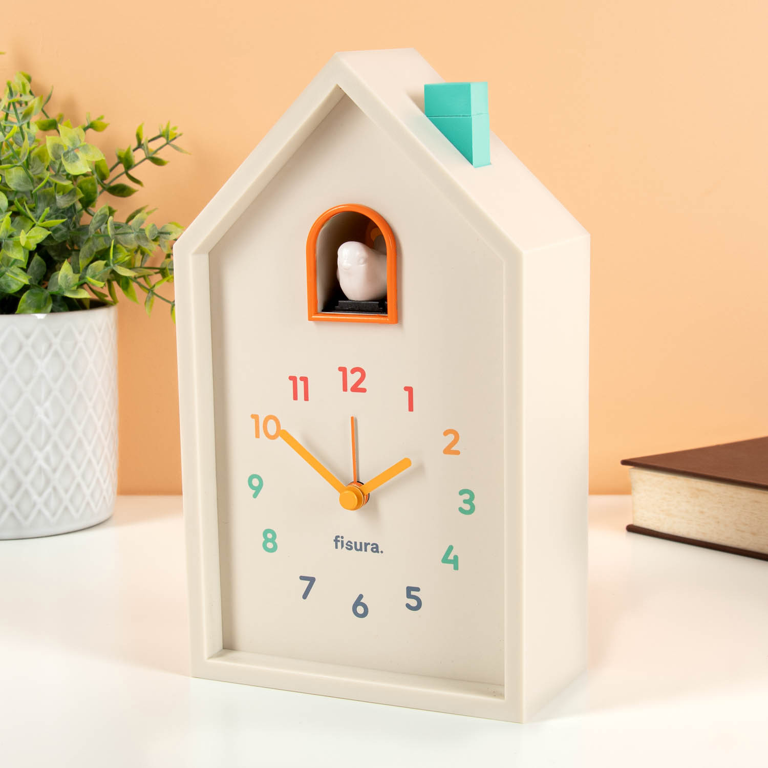Koekoeksklok wekker van Fisura. De ouderwetse koekoeksklok in een modern jasje en in compact formaat, zodat je hem als wekker kunt gebruiken. Trendy koekoeksklok in wit met een wijzerplaat in regenboogkleuren, gele wijzers en een wit vogeltje dat je wekt. De wekker werkt op 3 AAA-batterijen (niet inbegrepen). Afmeting: 20,5 x 12 x 6 centimeter.