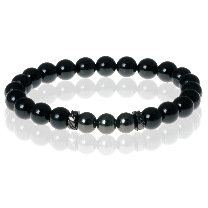 De armband is voorzien van gepolijste Agaat kralen en drie zwarte kralen die zijn vervaardigd uit een metaallegering met een zwarte coating. De drie zwarte kralen worden omringd door twee metalen schijven met zwarte zirkonia stenen. De armband is elastisch en geschikt voor een pols van 18-22cm. Draag de armband los, samen met een horloge of combineer meerdere armbanden.