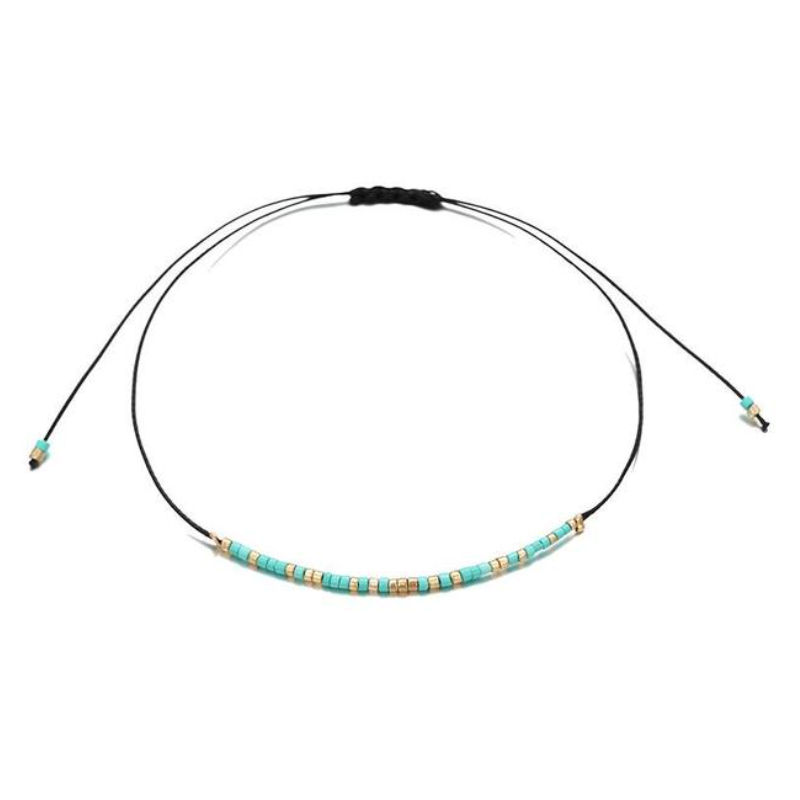 De zwarte touw armband is verfraaid met een opvallende rij felblauwe en goudkleurige kraaltjes, die een uniek accent geven aan de armband.