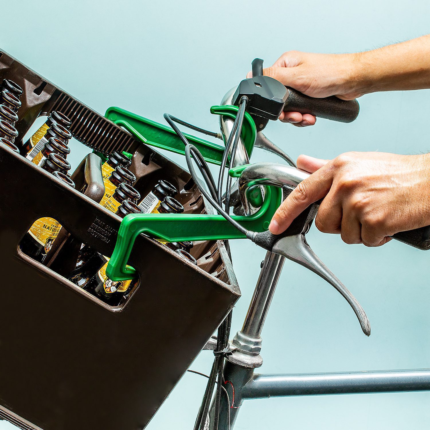 Krathaak (set van 2). Set van twee stevige haken waarmee je een krat bier aan je fiets kunt hangen. De krathaken zijn geschikt voor aan je stuur of de zijkant van je bagagedrager. Je klikt de twee haken vast aan de zijhandvatten of het middenhandvat van een krat bier en vervolgens aan je stuur of bagagedrager. Met twee krathaken kun je één krat bier vervoeren. Afmeting: 8,2 x 1,1 x 14 centimeter.
