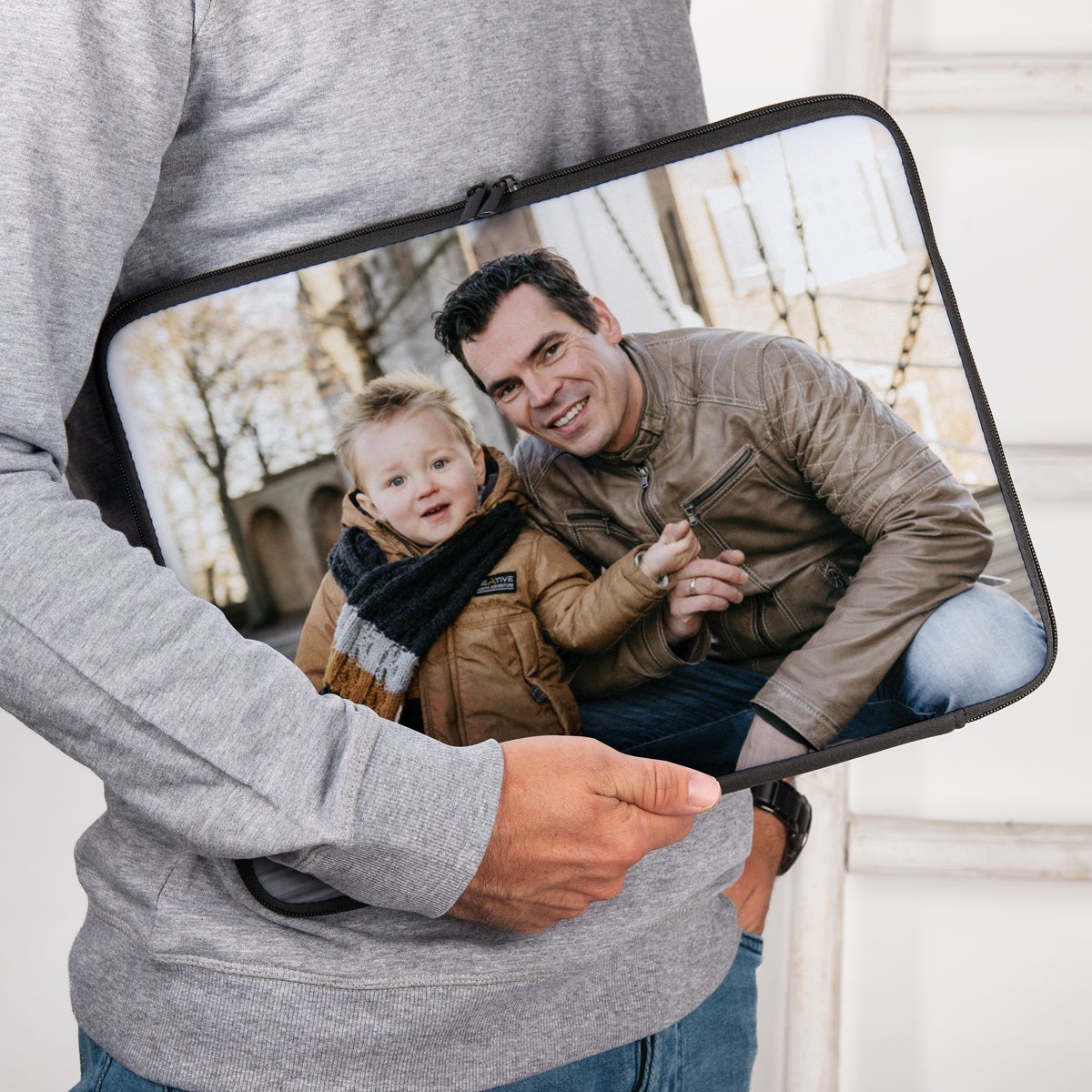 Een handige laptop sleeve bedrukken met naam en foto, gemaakt van neopreen. Aan een zijde volledig bedrukt met jouw ontwerp.