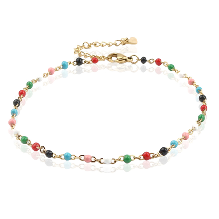 Het ontwerp bestaat uit een anker schakel enkelband met meerdere balletjes met een opvallende emaille afwerking in verschillende kleuren. Een perfecte aanvulling op elke zomerse outfit. De enkelband is verstelbaar en heeft een lengte van 23 + 4cm.